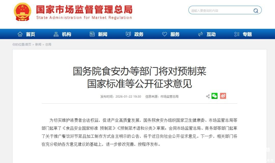 1月22日,国家市场监管总局发文表示,国务院食安办组织国家卫生健康委、市场监管总局等部门起草了《食品安全国家标准 预制菜》《预制菜术语和分类》草案,会同市场监管总局、商务部等部门起草了关于推广餐饮环节菜品加工制作方式自主明示的公告,将于近日向社会公开征求意见亿操盘,此举旨在切实维护消费者合法权益,促进产业高质量发展。