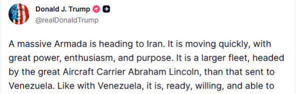 美中央司令部更是在特朗普首次发声威胁的当日放出消息,称美军“亚伯拉罕·林肯”号航空母舰打击群已驶入中东水域,并在次日宣布将举行空军战备演习。